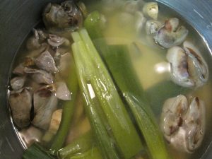 豚レバーが見当たらなかったので鶏の肝臓と砂肝(筋胃)でダシをとる。ネギとショウガで臭み消し。臭くもないし、あっさりしすぎてもない、案外しっかりした美味しい出汁が取れた。