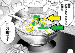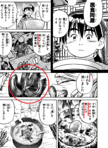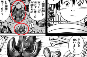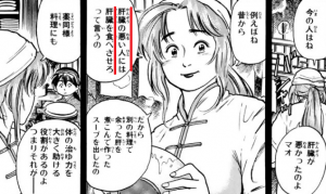 「内臓や胃」を使って出汁を取るらしい。明確に「肝臓を使う」とは書いてないし、長老の令嬢も明確に「肝臓を悪くしてる」とは書いてないけど、酒の飲みすぎってことだし、肝臓を悪くしてるっていう想像で。レバーも目立つように書いてあるし。