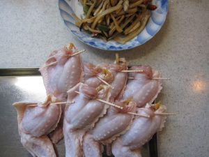 鶏一羽まるごとは食べきれないと思ったんで、手羽先に具を詰める。