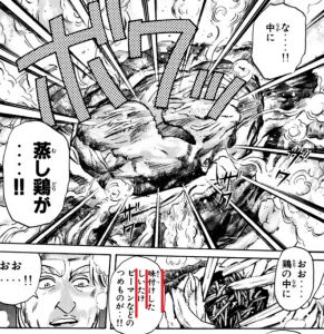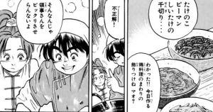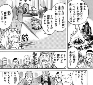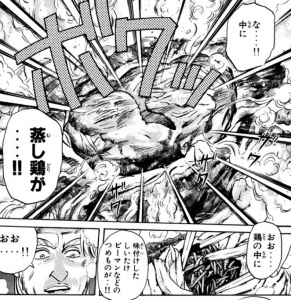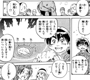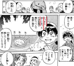 マオの働いているお店、「陽泉酒家」が放火されて火事になるんですが、マオはとっさに鶏をそば生地で包んで地面に埋めて、火事の熱で富貴鶏をつくってしまいました。料理バカ。
