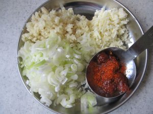 ネギとニンニクとショウガと豆板醤に唐辛子を足した。