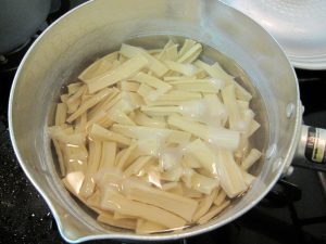 塩が抜けたら2時間くらい水で煮る。水で戻しただけの状態でも噛めないほどではないので、一回目はそのまま味を付けてしまったけど、それでは硬くて美味しく無い。本物の乾燥メンマみたいに戻した後も水で煮る。